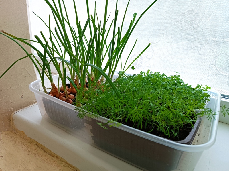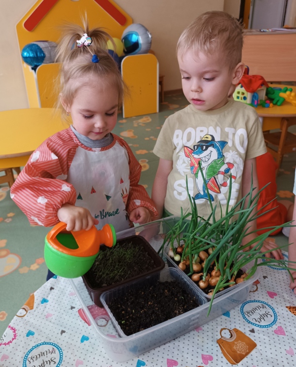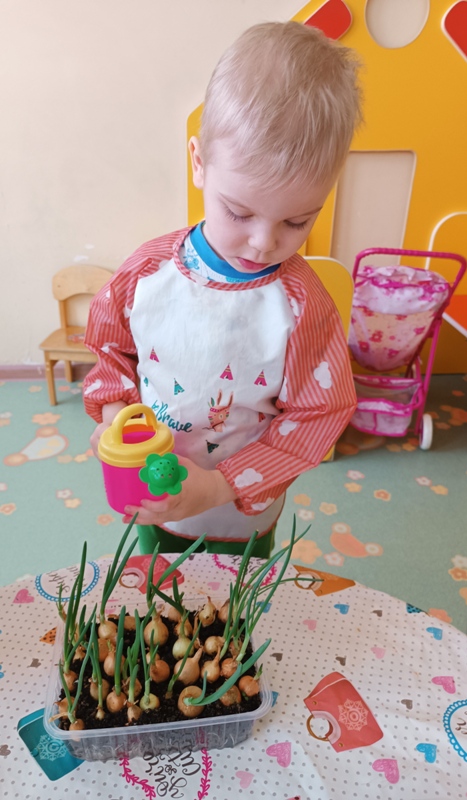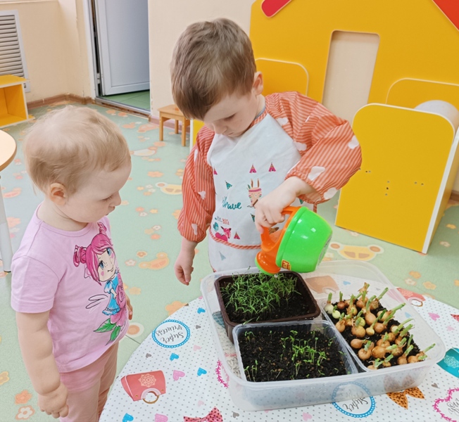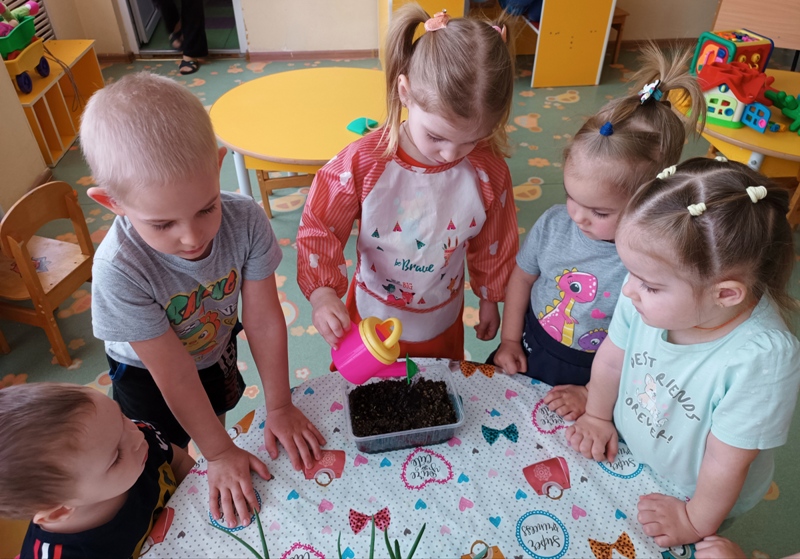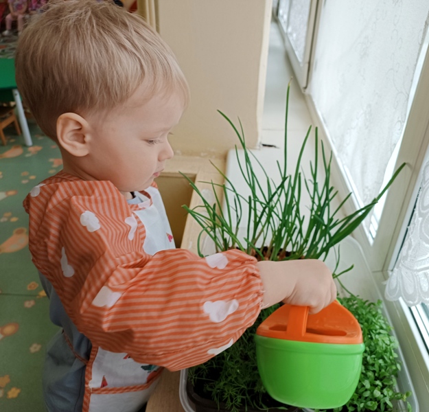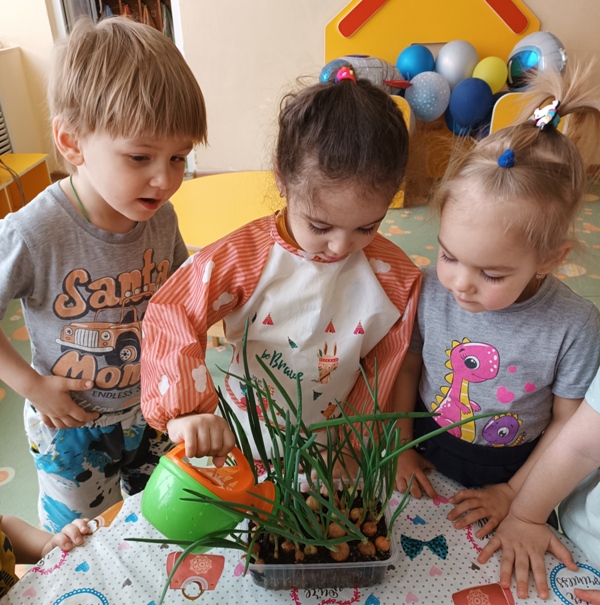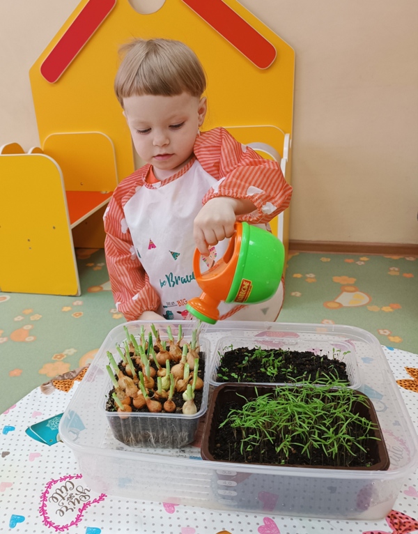 5 апреля в младшей группе №1 мы посадили мини огород на подоконнике. Этот увлекательный процесс вызвал интерес у каждого ребёнка. В течение месяца мы наблюдали за ростом растений, поливали, рыхлили землю, одним словом – заботились о растениях. И результат не заставил себя долго ждать – первым взошел лук. За этот месяц мы дважды успели его срезать. Зелёный лук пригодился на кухне – повара добавляли его в первые и вторые блюда. Вторым по счёту взошел укроп, дольше всего мы ждали всхода петрушки, но и она успела догнать в росте укроп. Ещё немного дадим подрасти зелени, и она также отправится на кухню.