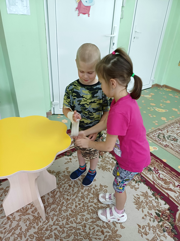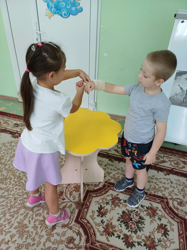 Дети с трепетом слушали рассказы воспитателей о сражениях, о храбрости воинов, рассматривали иллюстрации, читали стихи, посвященные нашим победителям. Затем дошколята приняли участие в соревновании "Окажи помощь раненому бойцу", которое никого не оставило равнодушным: каждому хотелось хоть на минуту побыть "солдатом" или "медсестрой"!