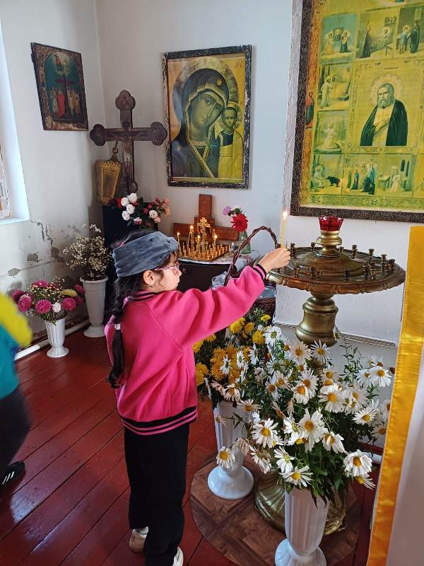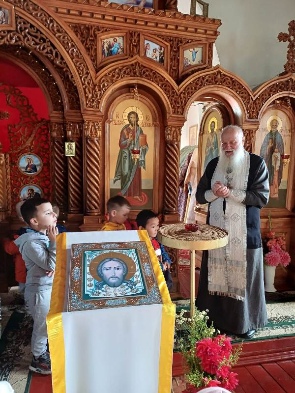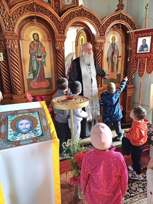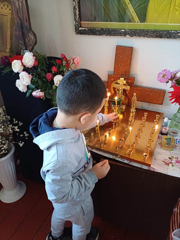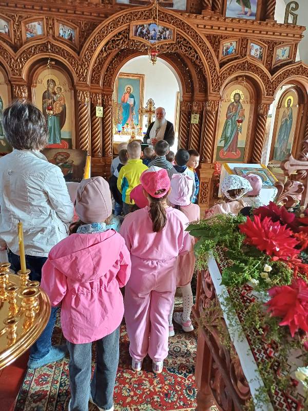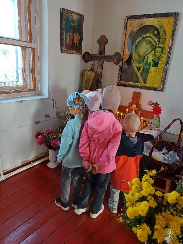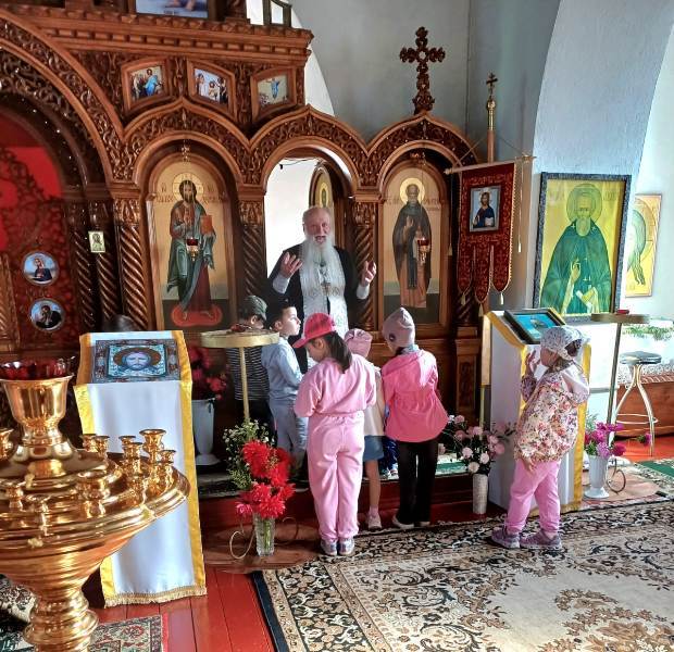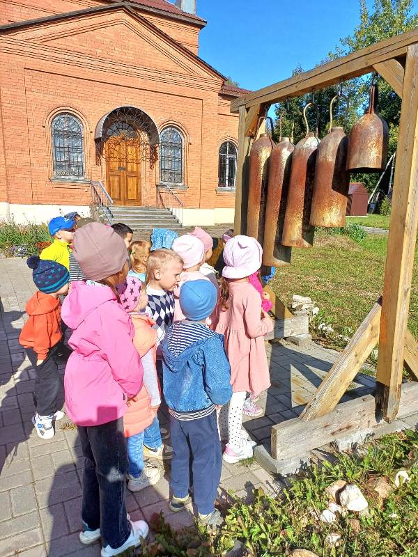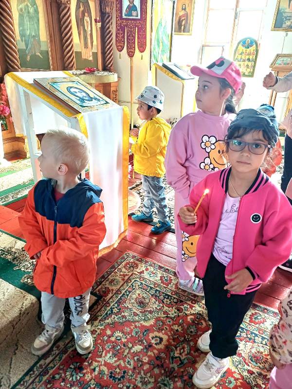 Сначала дети отправились на прогулку по терриротии храма, где смогли познакомиться с различными архитектурными элементами, такими как купола, кресты. Затем дошкольники познакомились с отцом Димитрием, который поведал о свече — символе жизни и света. Каждый из ребят с ощущением чувства таинства ставил зажженную свечку на лампаду. Поразил ребят церковный зал: красота его убранств, простор, спокойствие. Узнали малыши и о происхождении названия храма.