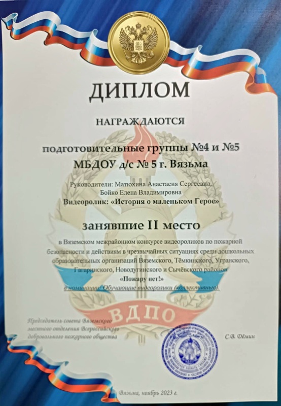Воспитанники подготовительной группы МБДОУ детского сада №5 г. Вязьмы Смоленской области заняли 2 место в межрайонном конкурсе видеороликов по пожарной безопасности и действиях в чрезвычайных ситуациях среди дошкольных образовательных организаций Вяземского, Темкинского, Угранского, Гагаринского, Новодугинского и Сычевского районов "Пожару нет!", организованный Всероссийским Добровольным Пожарным Обществом.