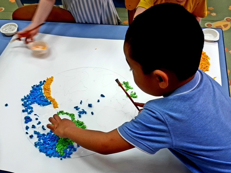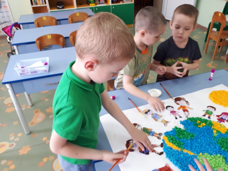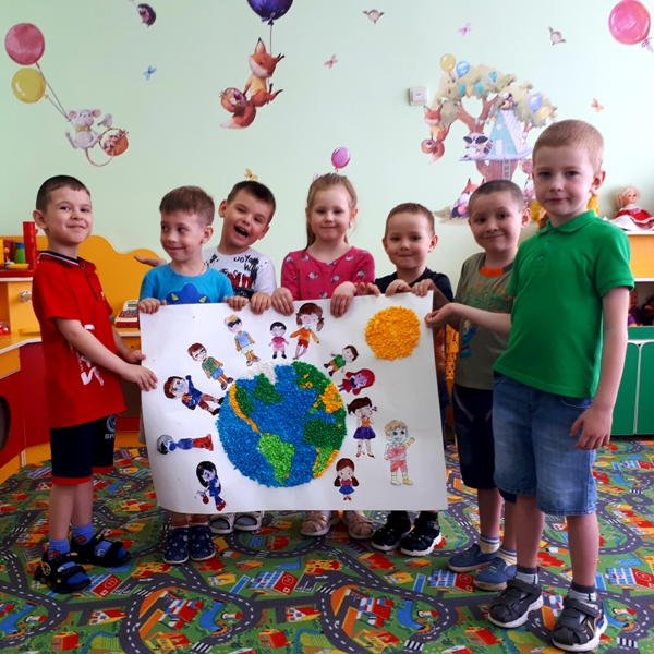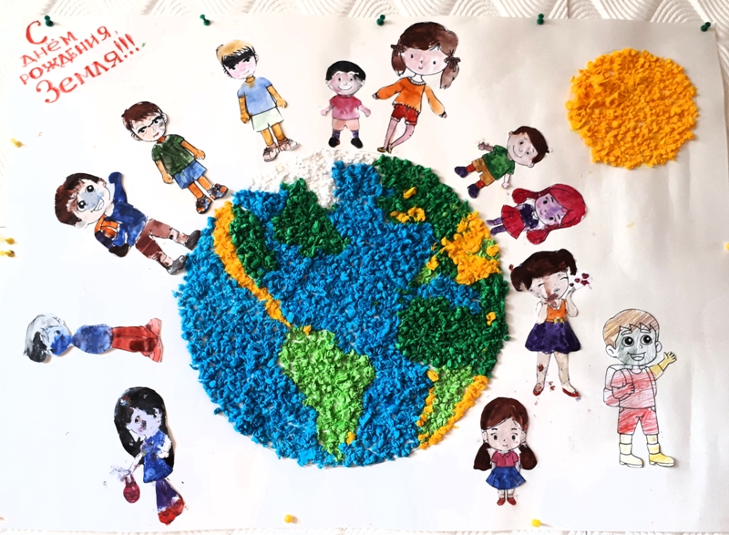 Ребята захотели видеть родную планету всегда красивой. С помощью воспитателя способом объёмной аппликации изобразили наш общий дом — Земной шар. Усилий приложили немало: старались все, ведь этот день посвящен нашей Земле. Раскрашенные дошкольниками силуэты-фигурки детей дружно встали вокруг своей планеты, как символ заботы о будущем Земли. Коллективная работа не только сплотила ребят, но и доставила настоящее удовольствие от результата совместного труда.