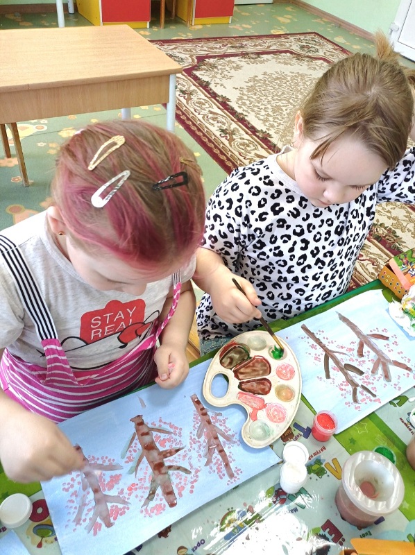 На затонированных листках бумаги дошколята нарисовали стволы деревьев, а затем брали связки ватных палочек, окунали в белый или розовый цвет на палитре, ставили палочки на бумагу и прокручивали их по часовой стрелке. Зеленой гуашью и чистой ватной палочкой дети наносили листья. И вот прекрасные яблоньки готовы!