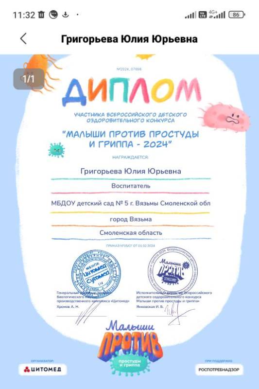 Наши воспитанники второй младшей группы стали участниками Всероссийского детского оздоровительного конкурса "Малыши против простуды и ГРИППа - 2024".