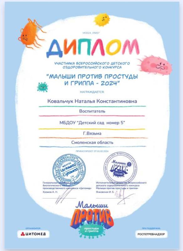Воспитанники старшей группы №2 под руководством воспитателя Ковальчук Н.К. принимают самое активное участие во Всероссийском детском оздоровительном конкурсе «Малыши против простуды и гриппа». Было проведено тематическое занятие, включающее презентацию по этой теме, игры на закрепление знаний о полезных и вредных продуктах. Викторина загадок и пословиц о здоровом образе жизни расширили и обогатили познания детей. Лучшей наградой для дошколят за правильные ответы стали эмблемки-цитовирки.
