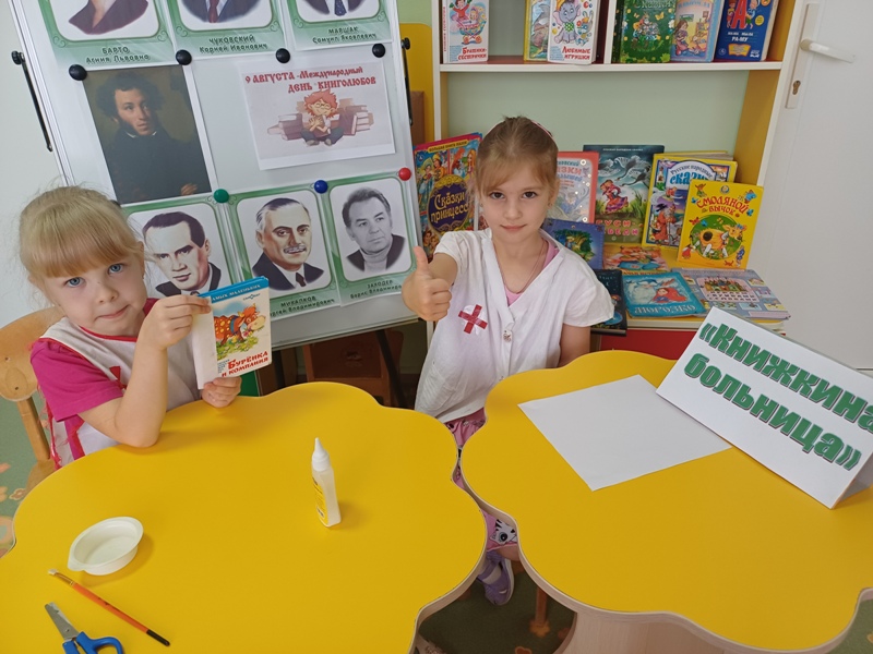 Вместе с воспитателем Бойко Е. В. дети организовали мастерскую "Книжкина больница", где они привели в порядок обложки книг. Все остались довольны результатом труда!
